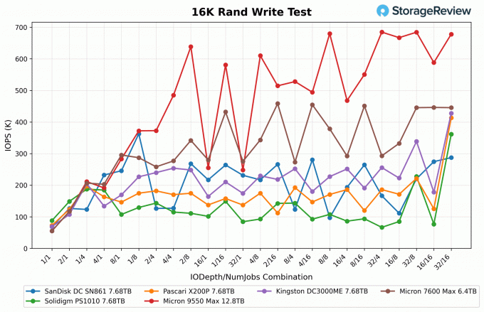 در تست 16K Sequential Write ، Micron 9550 Max (12.8TB) یک بار دیگر تسلط داشت ، با سرعت از 0.85 گیگابایت در ثانیه در انتهای پایین شروع تا اوج 10.7 گیگابایت در ثانیه و به طور متوسط 7.75GB/s در سراسر پاک کردنمایکرون 7600 مکس (6.4TB) با باند عملکرد باریک تر، از 0.84GB / s تا 6.8GB / s، به طور متوسط 5.63GB / s، که آن را به طور محکم پس از 9550 قرار می دهد اما هنوز هم در مقابل اکثر سایر درایوها است..